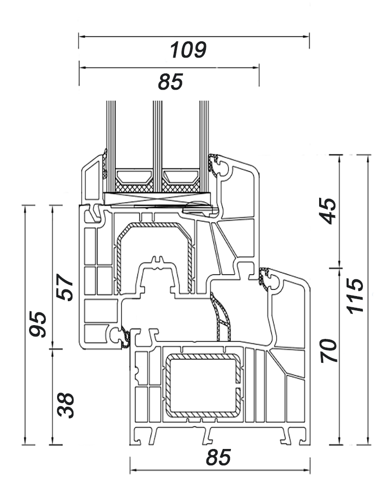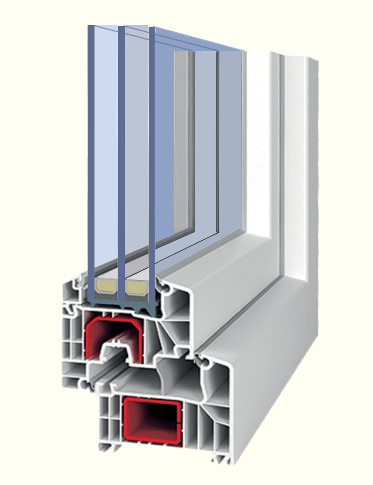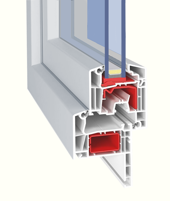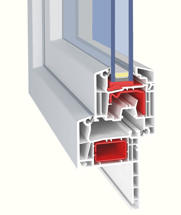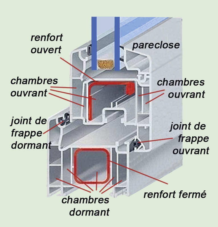 Le plastique n’étant intrinsèquement pas une matière rigide, pour raidir et solidifier les profilés, on leur insère les renforts en acier galvanisé. La coque où ils sont placés est compartimentée à l’intérieur avec les parois qui délimitent les espaces. Les chambres ainsi créées emprisonnant l’air en constituant par là des barrières isolantes. La qualité des profilés dépendent en conséquence du nombre de chambres, entre cinq et sept et de leur agencement mais pas seulement. D’autres facteurs sont tout aussi importants tel que la profondeur de profilé, l’épaisseur de la matière plastique, la forme la robustesse des renforts, le nombre et le type de joints etc.
